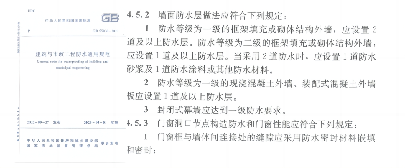 目前執(zhí)行的GB55030-2022《建筑與市政工程防水通用規(guī)范》對外墻防水的要求主要有三點: